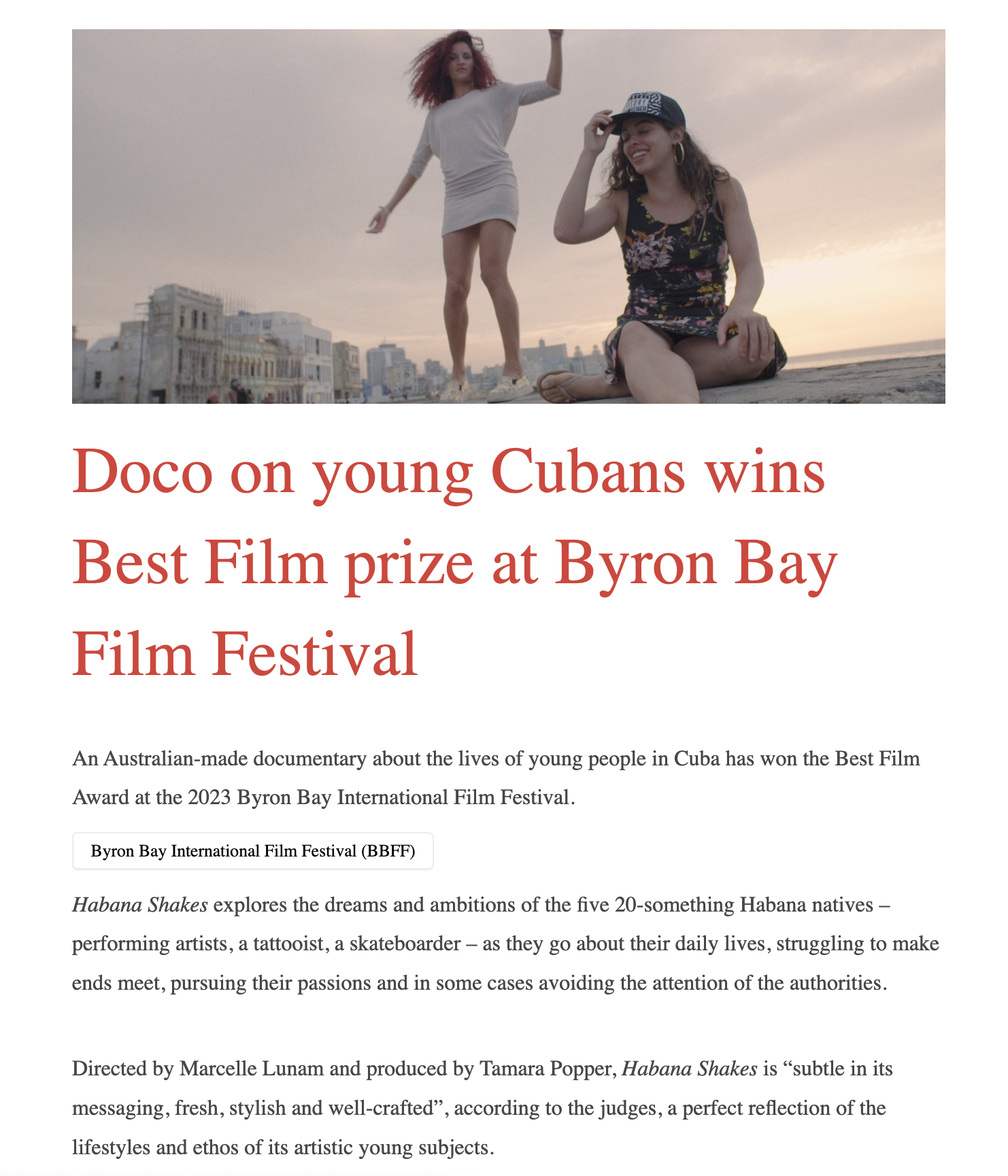 Habana Shakes wins Best Film at Byron Bay International Film Festival 2023 26 Oct Written By Joelle Baudet An Australian-made documentary about the lives of young people in Cuba has won the Best Film Award at the 2023 Byron Bay International Film Festival. Joelle Baudet